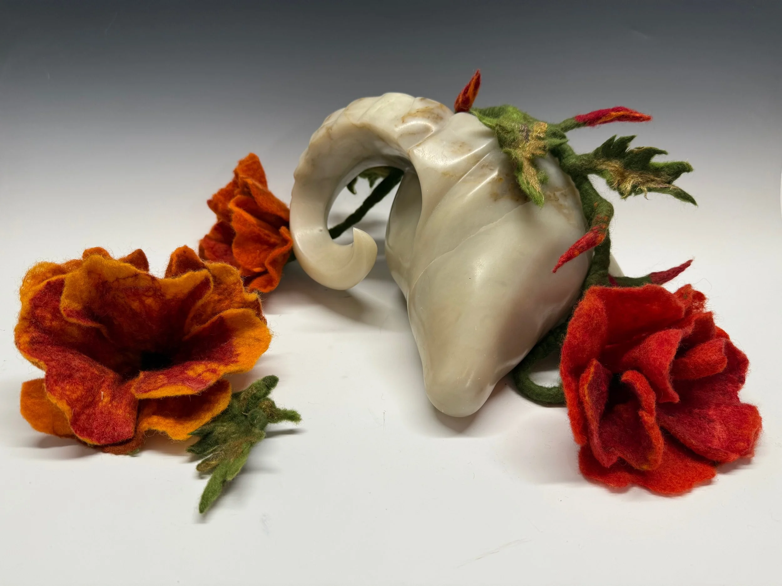 Traditionally depicted as a skeleton or a shedding snake, Death speaks not only of endings, but of transformation. In this sculpture, a soapstone ram’s head stands in silent stillness—expressionless, unmoving, inevitable. Around it bloom felted poppies, ancient symbols of both death and renewal in Mexican tradition.